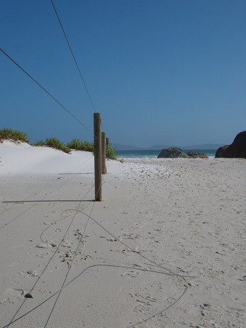 Unsere erste Station war der "Squeaky Beach", der weißeste Strand Australiens. In unserer Reisegruppe wurden heftigste Debatten über die Herkunft des Sandes geführt. Die eine Theorie nahm als Quelle des Sandes geriebene Korallen an, die andere kalkhaltige Ausscheidungen des Papageienfisches. Woher er auch kommen mag: der Sand ist so sauber, dass jeder Schritt ein quietschendes Geräusch (englisch: Squeaking) macht.